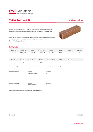 Protect 68 – Türblatt Typ Protect 68 (EI30, RC4) – Technisches DatenblattTechnisches Datenblatt der RWD Schlatter Türblatt‑Serie "Protect 68" (Stand 27.05.2025). Enthält Produktbeschreibung und Kennwerte: Dicke 67 mm, Gewicht 93 kg/m², Schallschutz Rw 42 dB, Wärme U_p 2,5 W/m²K, Klima 3a/3b/3c, Brand EI30, Einbruchklasse RC4, Beschussklasse FB4. Angaben zu Aufbau (Mittellage hochverdichtetes Buchenholz, beidseitiger Hartplatten‑Deckbelag, roh), Einsatzhinweis (nur auf Stahlzarge), maximale Fertigmaße (bis 2550 x 1400 mm; Max EI30 2640 x 1430 mm; Max RC4 2310 x 1250 mm) sowie Hinweis auf Anleitungen und Technische Merkblätter.PDF / 102 KB