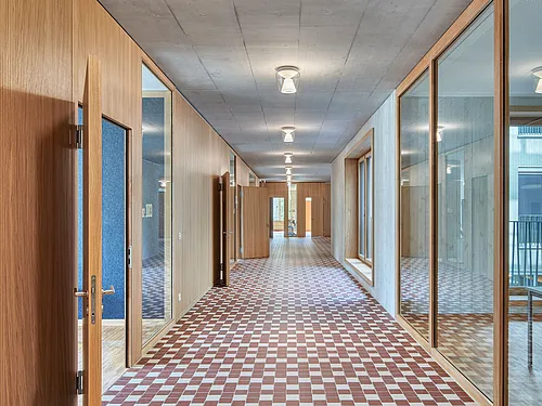Il livello secondario I comprende i tre tipi di scuola: speciale, intermedia e secondaria. Per enfatizzare l'atmosfera di calore desiderata, tutti gli elementi delle porte sono stati impiallacciati in quercia. Si tratta di porte UniStar per il controllo del suono e del clima e di porte SoundStar per l'isolamento acustico. Alcuni elementi hanno anche parti laterali in vetro incorporate, che garantiscono luminosità, trasparenza e una visione chiara.